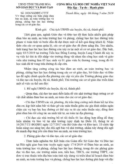 Nội dung công văn nêu: đặc biệt, ngày 3/5/2019 tại trường Tiểu học Đồng Lương, huyện Lang Chánh đã xảy ra vụ việc kẻ thủ ác đột nhập vào trường dùng vật nhọn tấn công học sinh và giáo viên nhà trường làm 5 học sinh và 1 giáo viên bị thương vong, trong đó 1 học sinh đã tử vong trên đường đi cấp cứu.