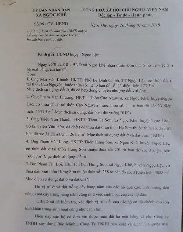Theo ông Dũng, trước đó UBND xã nhận được đơn xin hạ mặt bằng đất vườn và nhà ở của 5 hộ dân. Ngày 26/1/2018, UBND xã Ngọc Khê có công văn gửi UBND huyện về việc xin ý kiến chỉ đạo về việc các hộ dân xin hạ mặt bằng cải tạo đất, đồng thời để doanh nghiệp lấy đất san lấp ở khu vực thị trấn Ngọc Lặc.