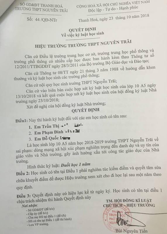 Trên cơ sở kết quả cuộc họp của Hội đồng kỷ luật, Hiệu trưởng nhà trường đã ra quyết định kỷ luật học sinh. Theo đó, có 3 học sinh bị đuổi học 1 năm, 4 học sinh bị đuổi học 1 tuần và 1 em bị cảnh cáo trước toàn trường.