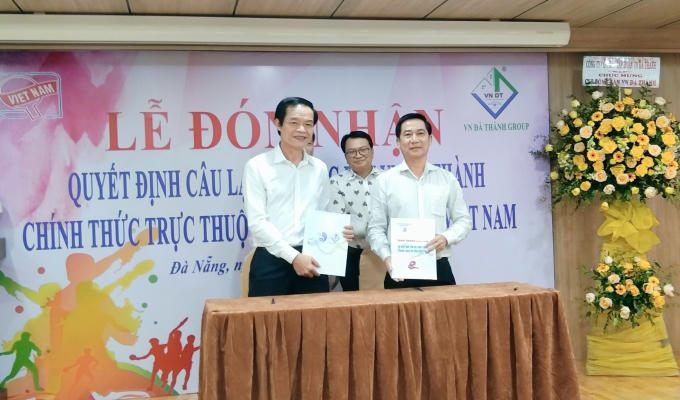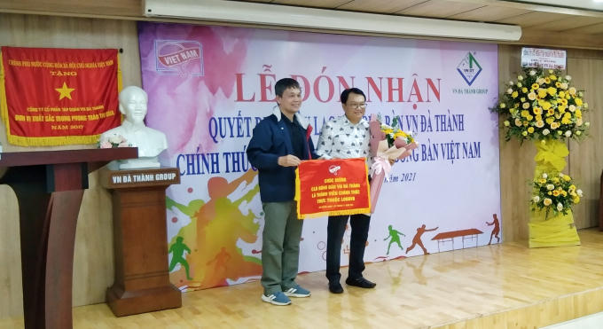 Lãnh đạo Tập đoàn VN Đà Thành nhận cờ chúc mừng việc Câu lạc bộ trở thành thành viên Liên đoàn.