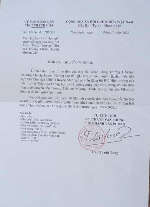 Trước đó, ngày 13/10/2022, UBND tỉnh Thanh Hoá có công văn gửi giám đốc Sở Nội vụ yêu cầu kiểm tra, giải quyết theo quy định của pháp luật, có văn bản trả lời ông Bùi Xuân Thảo và báo cáo Chủ tịch UBND tỉnh trước ngày 15/11/2022.