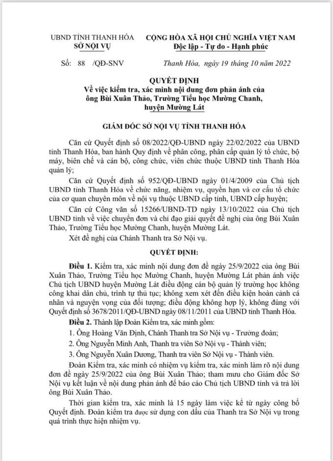Việc quyết định điều động luân chuyển của Chủ tịch UBND huyện Mường Lát đối với 6 phó hiệu trưởng các trường đang được Đoàn thanh tra Sở Nội vụ xác minh làm rõ.