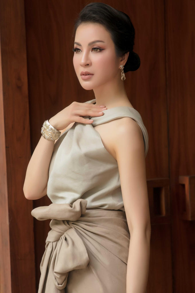 Nữ MC lựa chọn trang phục linen của nhà thiết kế Đỗ Mạnh Cường, kết hợp áo cổ yếm và chân váy mang gam màu trầm với họa tiết nơ làm điểm nhấn khéo léo, tóc búi cao cổ điển giúp tôn lên đường nét trên gương mặt.