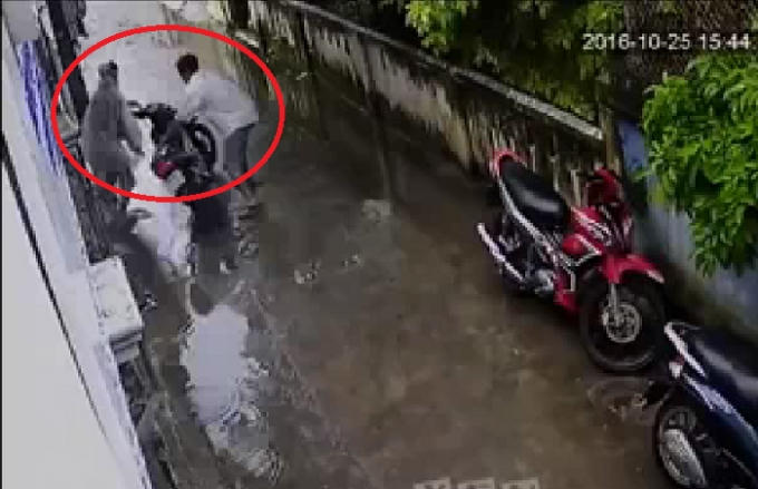 Theo đó, 2 người đàn ông điều khiển một chiếc xe máy đi vào ngách nhỏ. Một lúc sau, một trong 2 người đàn ông điều khiển chiếc xe lạ mang BKS: 79B1- 13.796 đi trở ra.