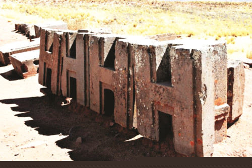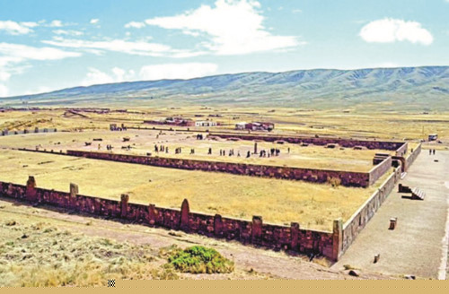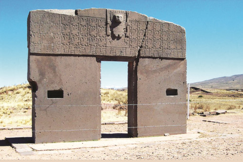 Cổng vào khu quần thể đền Kalasasaya tại Tiwanaku, có bậc chỉ làm từ một phiến đá nguyên khối dài đến 10m.
