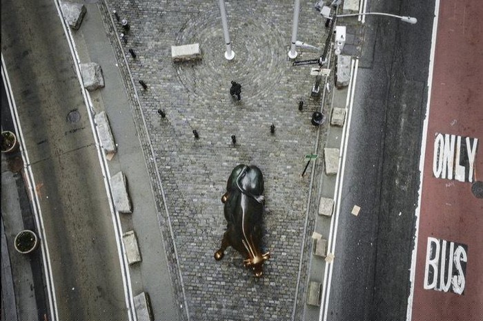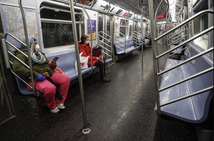 Charging Bull – một địa điểm thu hút khách du lịch gần thị trường chứng chứng khoán vốn luôn có đông du khách vây quanh, hiện giờ chỉ đứng một mình và xung quanh hoàn toàn vắng người. Những toa tàu trước đây chật ních giờ chỉ còn vài hành khách, tất cả đều đeo khẩu trang.