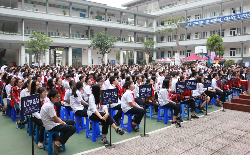 Hơn 1000 em học sinh chăm chú theo dõi chương trình.