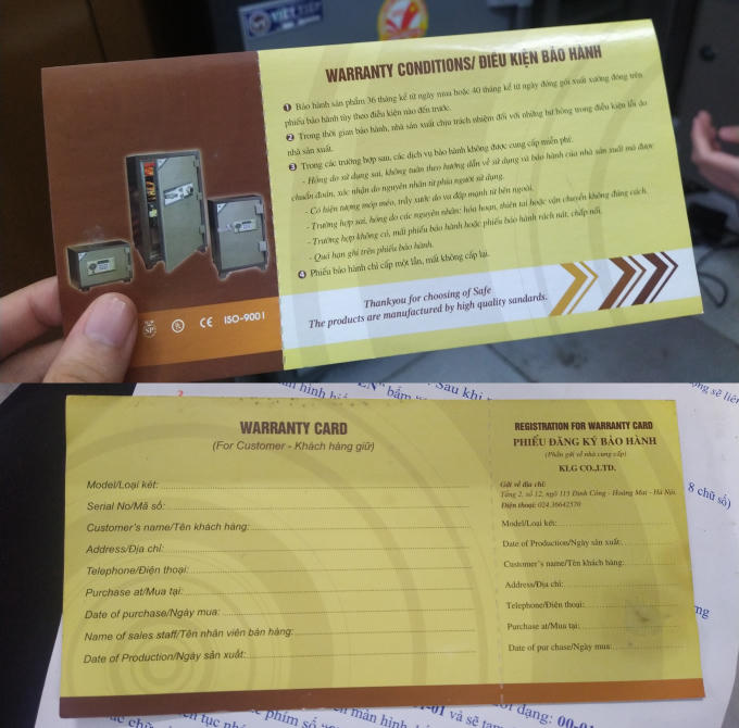 Tại một cửa hàng trên đường Láng, một sản phẩm két sắt được quảng cáo là hàng liên doanh giữa doanh nghiệp Việt Nam và nước ngoài. Tuy nhiên, giấy bảo hành lại không có bất kỳ thông tin gì về nơi sản xuất, số serial...