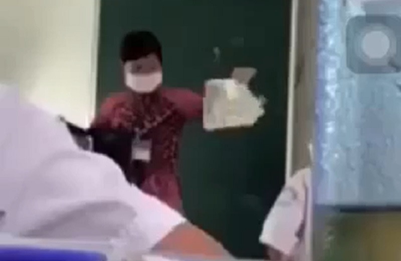 Trước đó, trên mạng xã hội xuất hiện clip ghi lại cảnh một thầy giáo thẳng tay tát nam học sinh và 1 đoạn clip khác ghi lại cảnh cô giáo thả từng cuốn sách, cuốn vở của một nam sinh xuống đất.