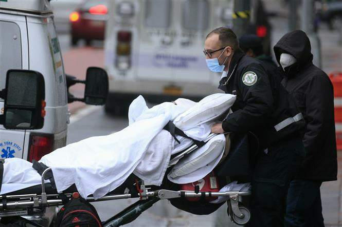 Nhân viên y tế chuyển bệnh nhân mắc COVID-19 vào một bệnh viện ở New York, Mỹ. Ảnh: AFP/TTXVN