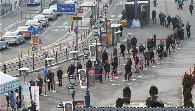 Nhân viên y tế lấy mẫu xét nghiệm COVID-19 cho người dân tại trung tâm xét nghiệm tạm thời ở ngoại ô Seoul, Hàn Quốc ngày 26/12/2020. Ảnh: Yonhap/TTXVN