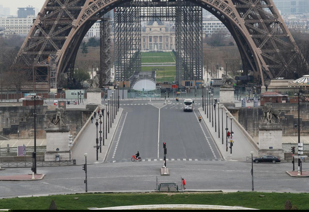 Chân tháp Eiffel thưa thớt bóng người vào tháng 3/2020, khi Paris bị phong tỏa do Covid-19. Ảnh: Franceinfo