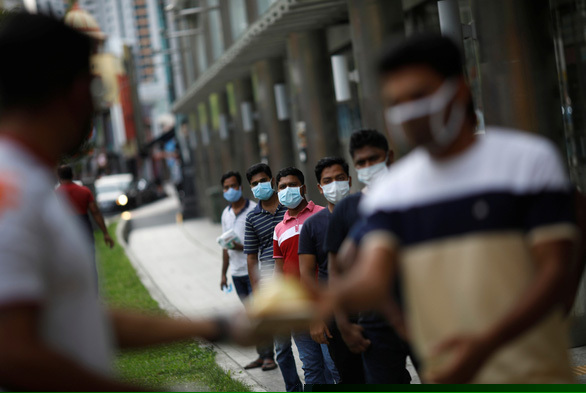 Người lao động nhập cư xếp hàng nhận cơm từ một nhóm tình nguyện ở Singapore tháng 4/2020. Ảnh: Reuters