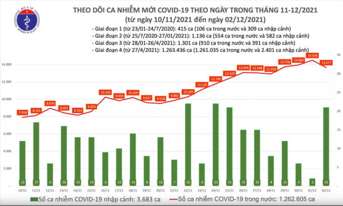Tính từ 16h ngày 1/12 đến 16h ngày 2/12, trên Hệ thống Quốc gia quản lý ca bệnh Covid-19 ghi nhận 13.698 ca nhiễm mới, trong đó 21 ca nhập cảnh và 13.677 ca ghi nhận trong nước (giảm 829 ca so với ngày trước đó) tại 60 tỉnh, thành phố (có 7.538 ca cộng đồng).