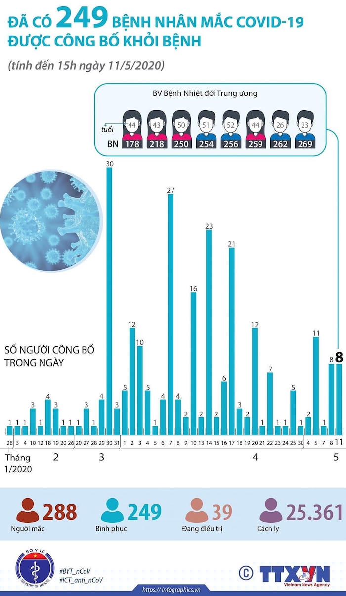 Ngày 11/5/2020, thông tin từ tiểu Ban điều trị – Ban Chỉ đạo Quốc gia phòng, chống dịch COVID-19 cho biết, có 8 bệnh nhân mắc COVID-19 tại bệnh viện Bệnh Nhiệt đới Trung ương được công bố khỏi bệnh, cụ thể: