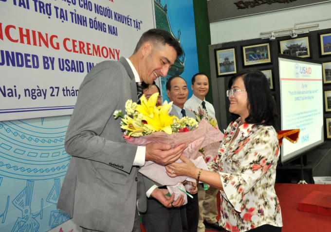 Bà Nguyễn Hòa Hiệp, phó chủ tịch UBND tỉnh Đồng Nai tặng hoa cho ông Christopher Abrams, Giám đốc Phòng Môi trường và Phát triển xã hội, Cơ quan phát triển quốc tế Hoa Kỳ.