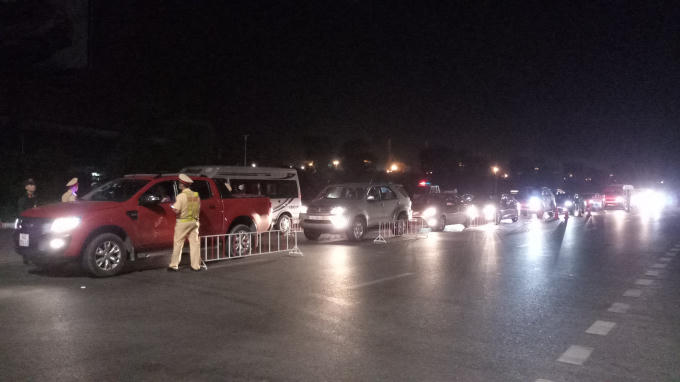 Hàng loạt các phương tiện nối theo nhau theo trình tự vào làn đường thực hiện công tác đo nồng độ cồn.
