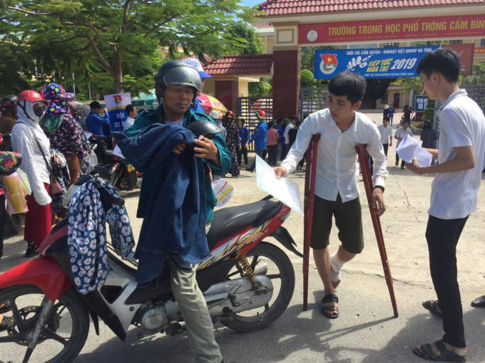 Tại điểm trường THPT Cẩm Bình, huyện Cẩm Xuyên, Hà Tĩnh em Trần Công Tâm (lớp 12A, Trường THPT Cẩm Bình, huyện Cẩm Xuyên) bị gãy chân phải chống nạng để tham gia kỳ thi THPT Quốc gia 2019.