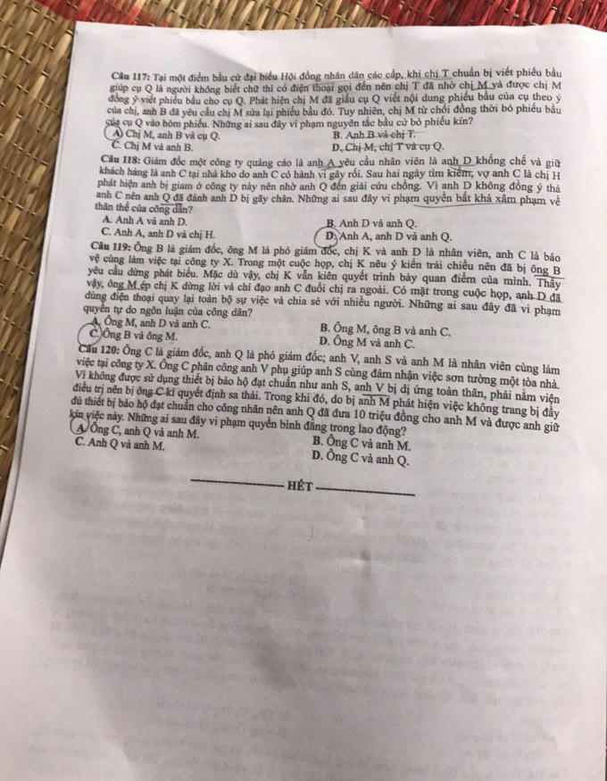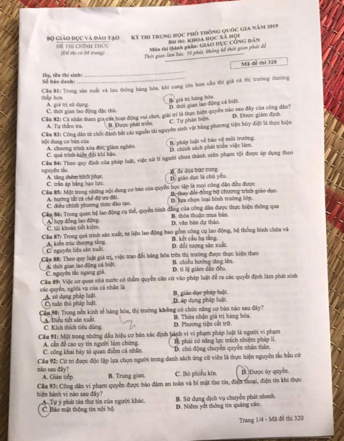 Đề thi môn Giáo dục công dân, mã đề 320. Ảnh: Thu Hà