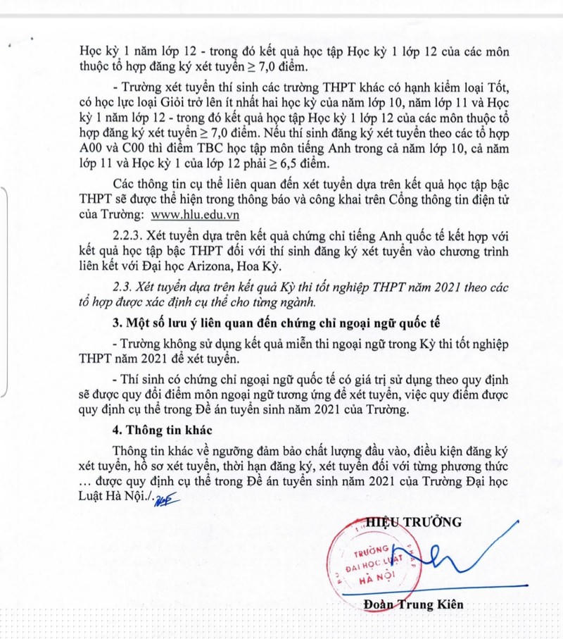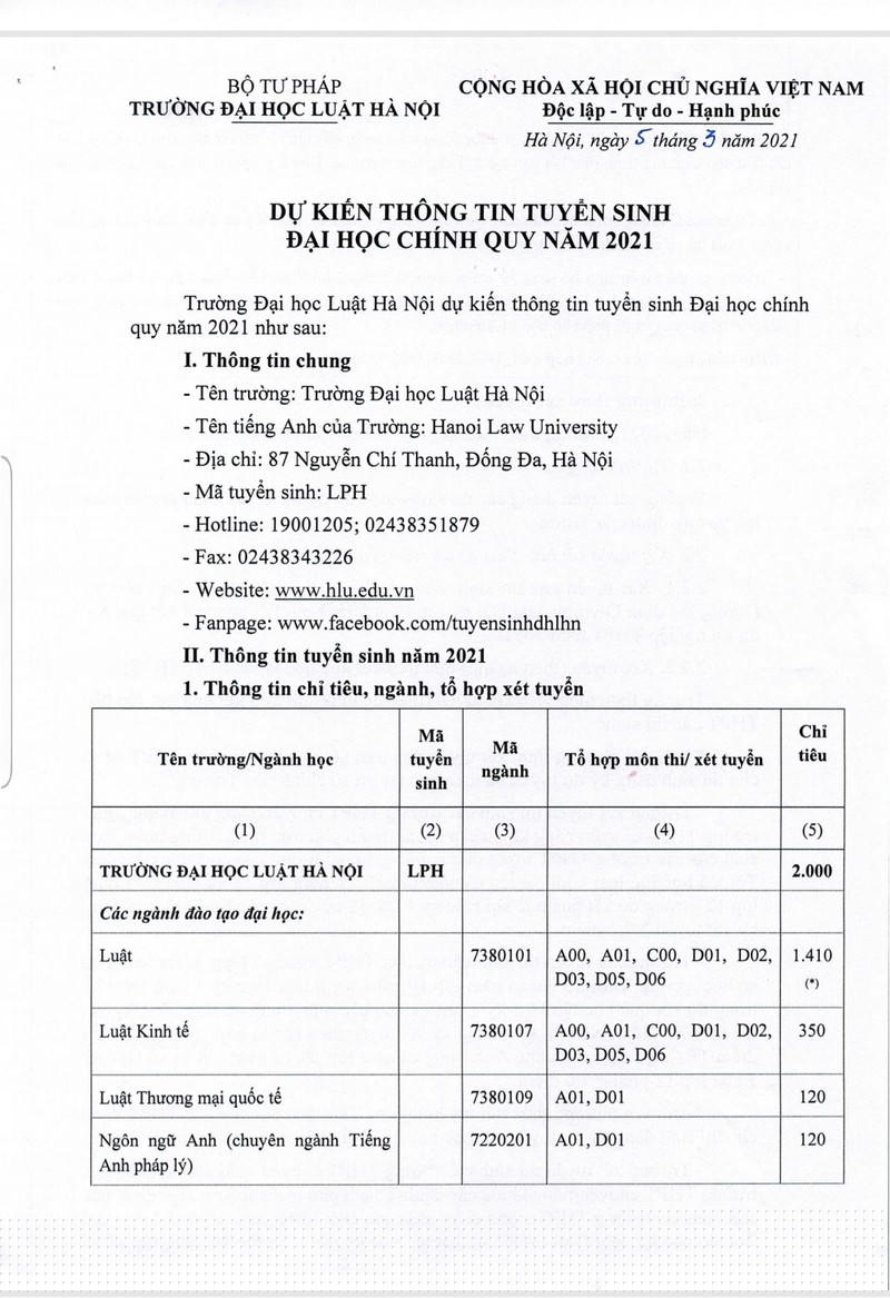 Chiều 5/3, Hiệu trưởng Trường Đại học Luật Hà Nội –TS. Đoàn Trung Kiên đã ký văn bản dự kiến thông tin tuyển sinh Đại học chính quy năm 2021. Theo đó, có rất nhiều điểm mới đáng chú ý trong kỳ thi tuyển sinh năm nay vào Trường.