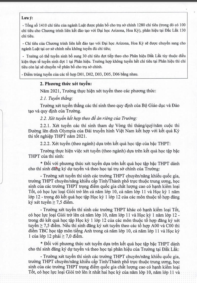 Ngoài các tổ hợp xét tuyển truyền thống là A00, A01, C00, D01, D02, D03, năm 2021 trường xét tuyển các tổ hợp mới là D05 (Ngữ văn, Toán, Tiếng Đức) và D06 (Ngữ văn, Toán, Tiếng Nhật) cho các ngành Luật và Luật Kinh tế.