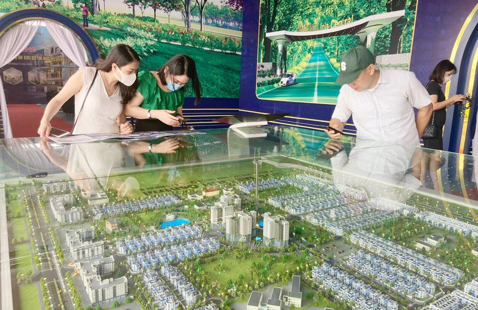 Khách hàng tham khảo một dự án bất động sản tại huyện Mê Linh. Ảnh: Phạm Hùng