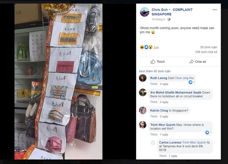 Một cửa hàng ở khu Tampines đã mở đầu tháng Bảy Âm lịch bằng lời quảng cáo về khẩu trang hàng mã là đồ cúng cho người chết. “Trong trường hợp khách hàng thắc mắc, thì họ có thể thấy trên bao bì nói rõ rằng đây là khẩu trang dành cho người đã khuất”.