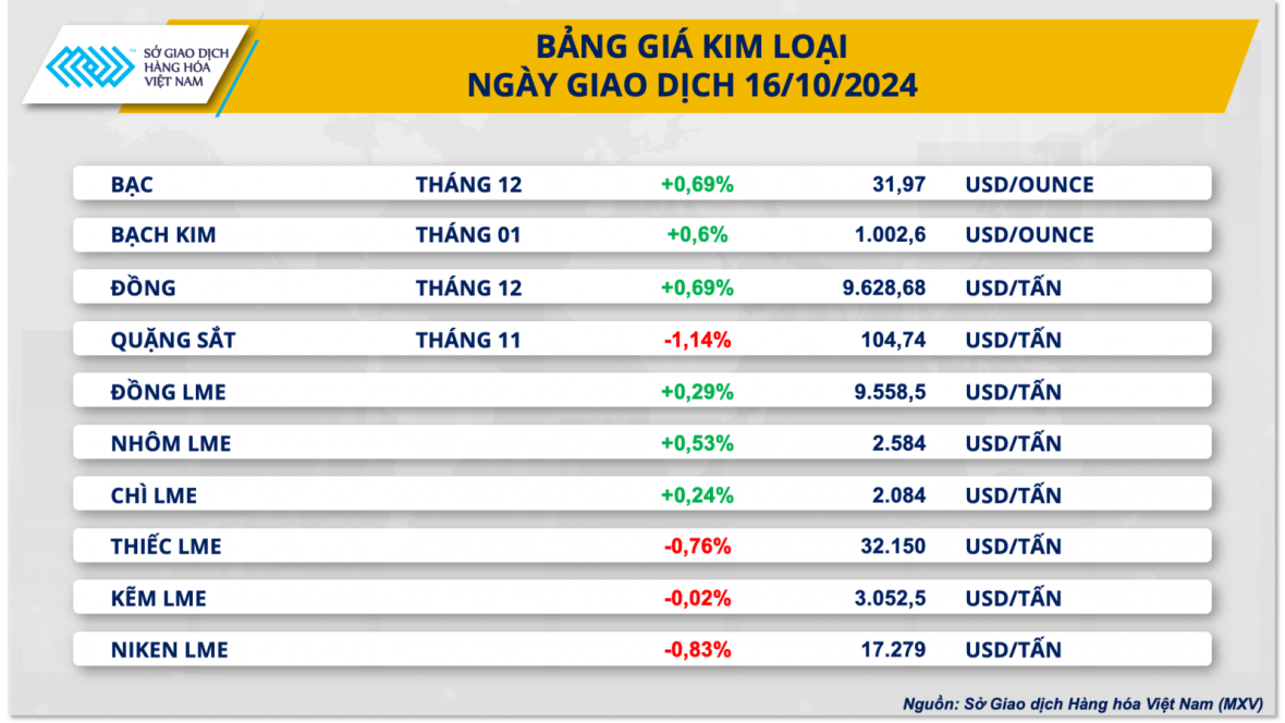 Theo Sở Giao dịch Hàng hóa Việt Nam (MXV), đóng cửa phiên giao dịch hôm qua (16/10), chỉ số MXV-Index giảm nhẹ 0.23% về mức 2.168 điểm, đánh dấu ba phiên liên tiếp suy yếu. Thị trường kim loại phục hồi, tuy nhiên chiều ngược lại, giá đường thô giảm về mức đáy trong vòng gần một tháng qua.