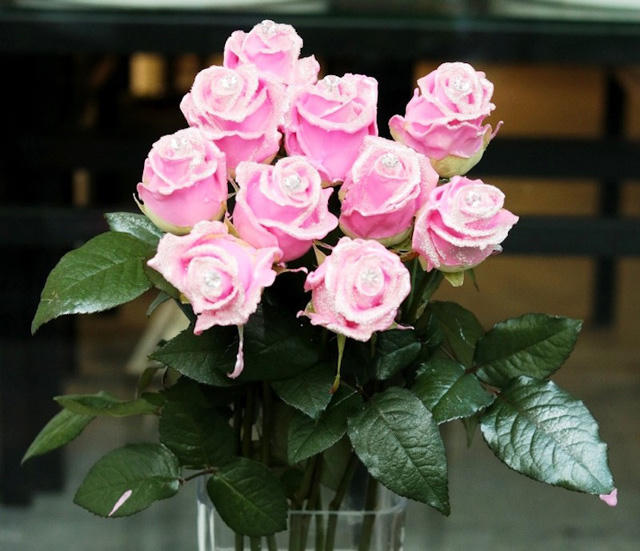 Hoa hồng Pink Diamond còn được gọi là hoa hồng kim cương. Loại hoa này được phủ một lớp socola màu hồng, cánh hoa còn được phủ thêm một lớp bột nhũ lấp lánh, chính giữa bông hoa được đính một hạt đá pha lê sang trọng. Mỗi bông hoa được bán với giá 250.000 đồng.