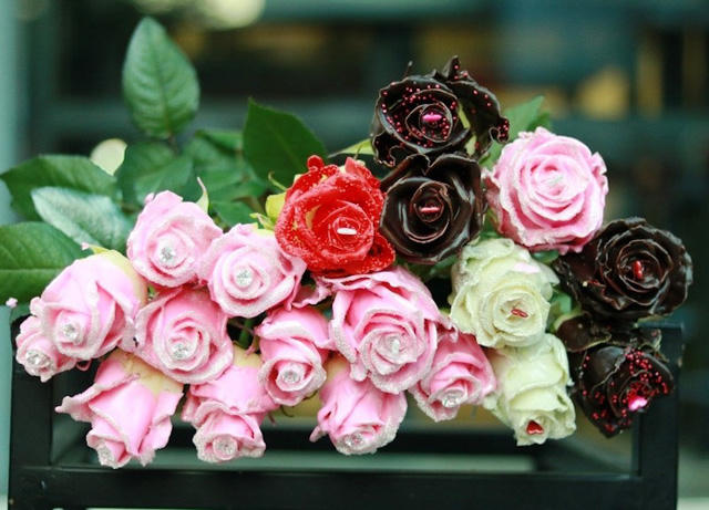 Theo ghi nhận của chúng tôi tại nhiều cửa hàng hoa tươi khác tại quận 1, quận 3, quận 10..., hoa hồng phủ socola màu nhũ vàng, màu đỏ hay hoa hồng đính hạt socola nhiều màu cũng thu hút người mua. Giá những loại hoa nhập khẩu này dao động từ 200.000 – 250.000 đồng/1 bông.