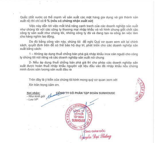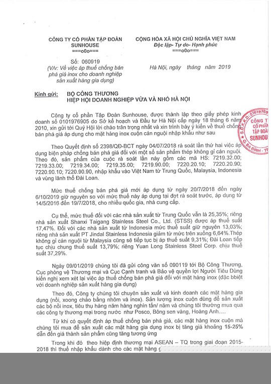 Văn bản của Tập đoàn Sunhouse gửi các cơ quan chức năng đề nghị không áp thuế chống bán phá giá đối với mặt hàng nhập khẩu inox cán nguội.