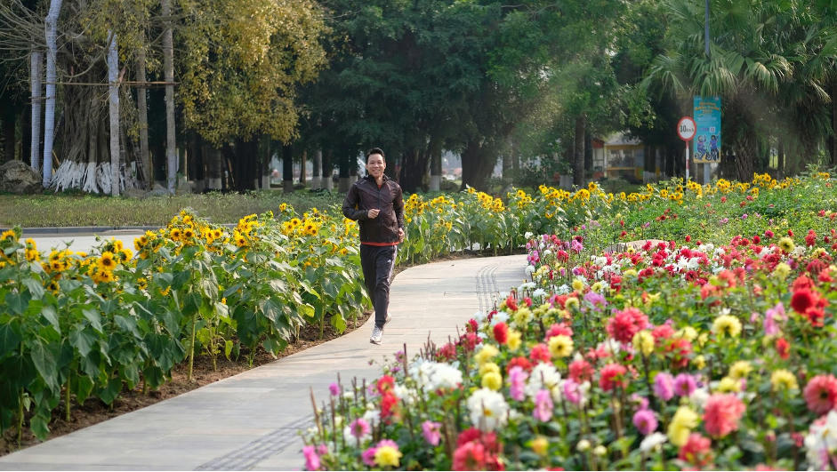 Anh Thành chạy giữa đường hoa đua nhau khoe sắc ở Ecopark. Ảnh: NVCC