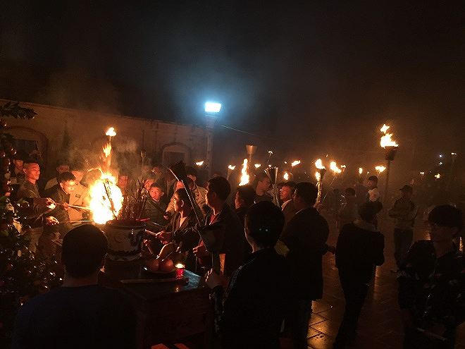Cứ thế, đuốc ùa vào, lửa túa ra, chạy vòng quanh sân rồi chia về khắp các con đường trong xóm. Nghi thức diễn ra chóng vánh, khí thế và không chen lấn, chỉ thấy bóng người lao xao rộn rã, ánh điện trong Đình cũng đã phụt tắt, chỉ còn ánh lửa rực rỡ soi chiếu khắp các mặt người.
