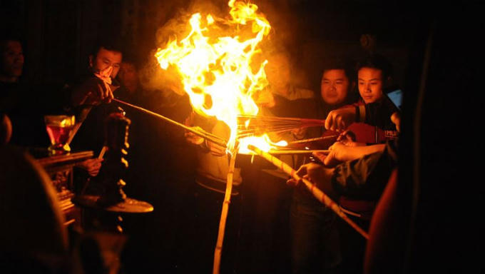 Ngọn lửa Thánh được ông thủ đình truyền từ mâm cúng Thành Hoàng đêm giao thừa ra ngoài sân đúng lúc tiếng chuông sang canh vừa điểm. Khoảnh khắc này những trai làng đổ xô vào tim lửa le lói đó với cây đuốc của mình. Những đầu đuốc đầy bấc tẩm dầu như những mũi tên cắm đúng hồng tâm, bừng lên trong khoảnh khắc.