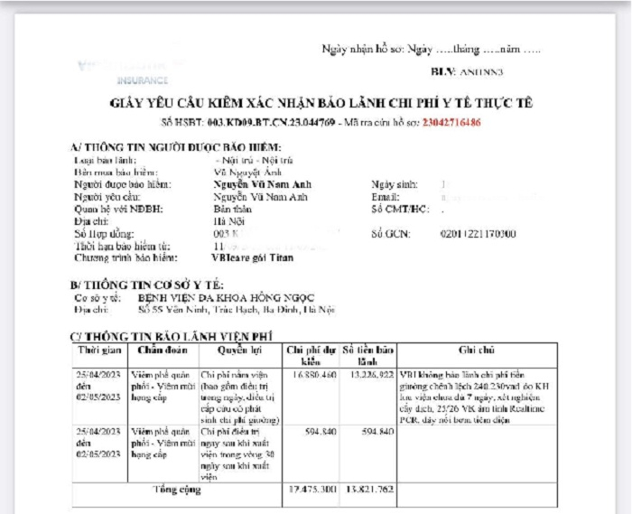 Ảnh chụp một ca chi trả từ bảo hiểm mà chị Ánh nhận được.