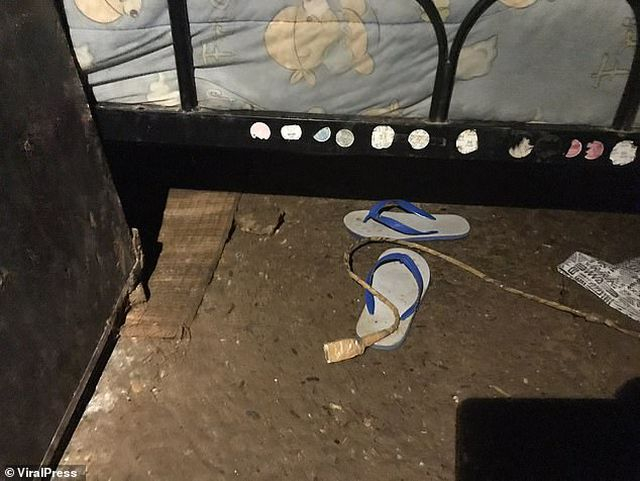 Ổ cắm mà Nong Ying đã dùng để sạc điện thoại với phần dây điện đã sờn cũ và phải bọc bằng băng dính