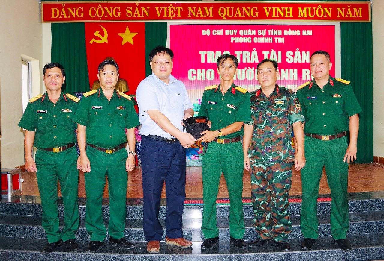 Thiếu tá Trần Văn Sử và lãnh đạo Bộ Chỉ huy Quân sự tỉnh Đồng Nai trao lại tài sản cho công dân