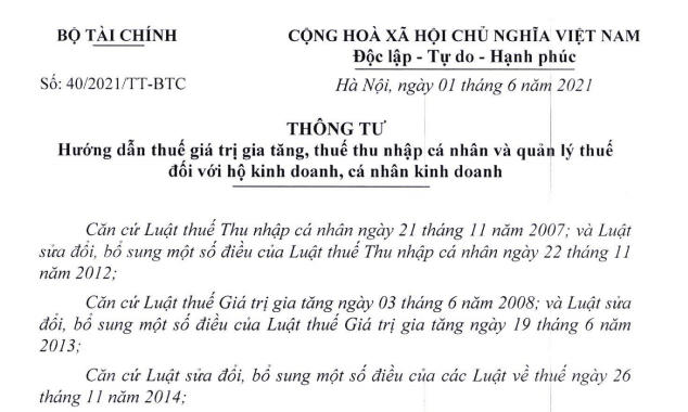 Theo tin từ Bộ Tài chính, Bộ này vừa ban hành Thông tư 40, hướng dẫn thuế giá trị gia tăng (GTGT), thuế thu nhập cá nhân (TNCN) và quản lý thuế đối với hộ kinh doanh, cá nhân kinh doanh.