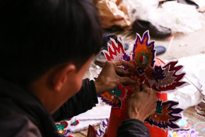 Nhờ máy in, ngày nay thợ làm hàng mã không còn phải dày công vẽ màu cho đồ ông Công ông Táo như trước. Với mức giá sản phẩm trên dưới 50.000 đồng, người thợ cắt dán được khoảng 100 bộ mỗi ngày.