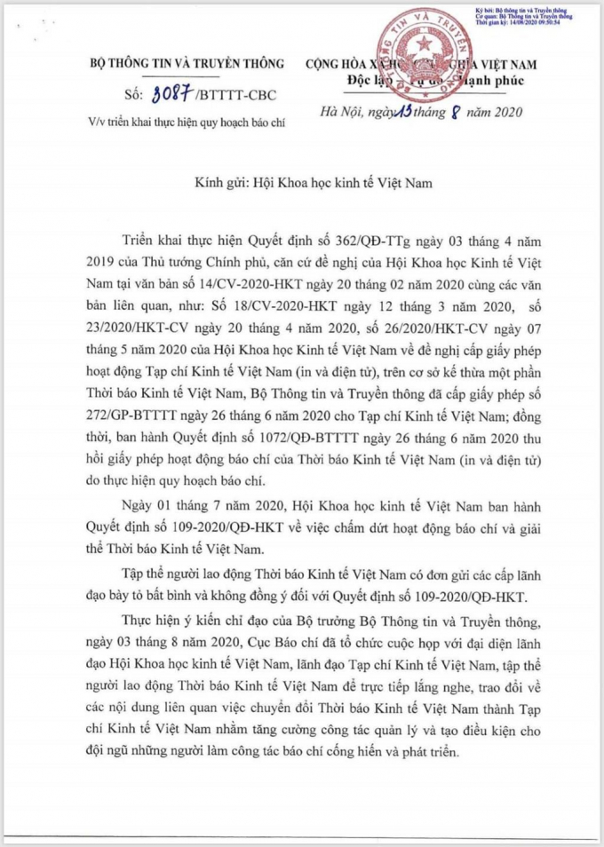 Quá thời hạn 3 tháng, kể từ ngày Giấy phép có hiệu lực, TCKTVN không có sản phẩm báo chí xuất bản, Bộ TT&TT sẽ ra quyết định thu hồi Giấy phép. Ý kiến chính thức của Bộ TT&TT đối với việc thực hiện quy hoạch báo chí của Thời báo Kinh tế Việt Nam được công bố ngay sau cuộc họp ngày 3-8-2020 giữa Cục báo chí (Bộ TT&TT), Vụ báo chí - xuất bản (Ban tuyên giáo trung ương), Ban Kiểm tra (Hội nhà báo Việt Nam) với đại diện lãnh đạo Hội Khoa học kinh tế Việt Nam, lãnh đạo Tạp chí Kinh tế Việt Nam, tập thể người lao động Thời báo Kinh tế Việt Nam.