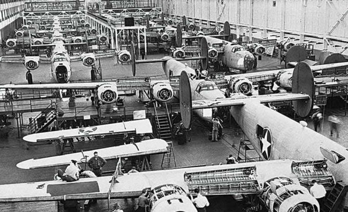 Dây chuyền sản xuất tại nhà máy ném bom Willow Run của hãng xe Ford. Đến năm 1945, Ford đã tung ra máy bay B-24 Liberators với tốc độ một chiếc mỗi giờ.