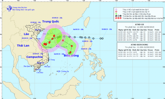 Trung tâm dự báo Khí tượng Thủy văn Trung ương cho biết, vào hồi 10h ngày 2/9, vị trí tâm áp thấp nhiệt đới ở vào khoảng 18,6 độ Vĩ Bắc; 110,5 độ Kinh Đông, phía Đông đảo Hải Nam. Sức gió mạnh nhất vùng gần tâm áp thấp nhiệt đới mạnh cấp 6-7 (40-60km/giờ), giật cấp 9. Bán kính gió mạnh cấp 6, giật cấp 8 khoảng 100km tính từ tâm áp thấp nhiệt đới.