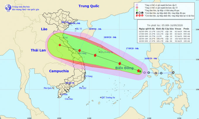 Dự báo trong 24 giờ tới, bão di chuyển theo hướng Tây Tây Bắc, mỗi giờ đi được khoảng 15km và có khả năng mạnh thêm. Đến 4 giờ ngày 17/9, vị trí tâm bão ở khoảng 14,3 độ Vĩ Bắc; 115,1 độ Kinh Đông, cách quần đảo Hoàng Sa khoảng 450km về phía Đông Nam. Sức gió mạnh nhất vùng gần tâm bão mạnh cấp 9 (75-90km/giờ), giật cấp 11.