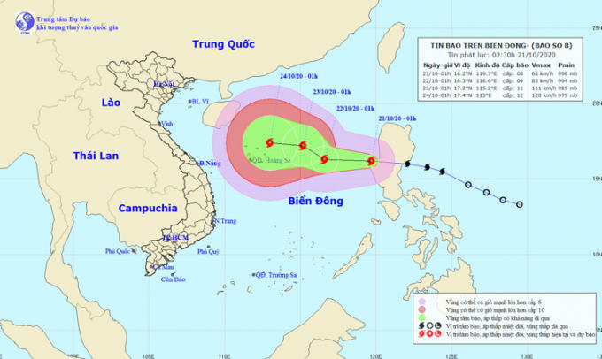 Hồi 1 giờ ngày 21/10, vị trí tâm bão ở khoảng 16,2 độ Vĩ Bắc; 119,7 độ Kinh Đông, cách quần đảo Hoàng Sa khoảng 790km về phía Đông Đông Nam. Sức gió mạnh nhất vùng gần tâm bão mạnh cấp 8 (60-75km/giờ), giật cấp 10.