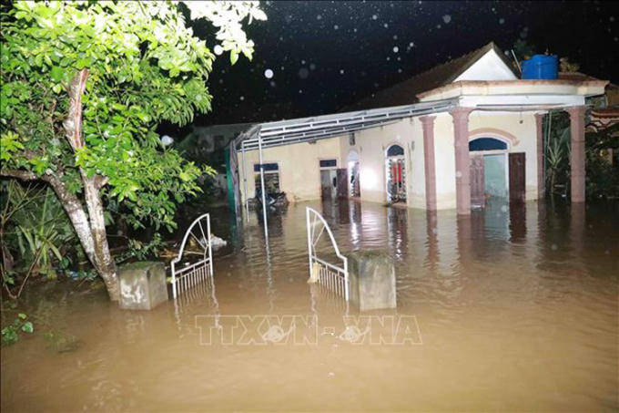 Thôn Ngũ Phúc, xã Cẩm Vinh, huyện Cẩm Xuyên (Hà Tĩnh) tiếp tục cô lập vì lũ lụt. Ảnh: Vũ Sinh - TTXVN