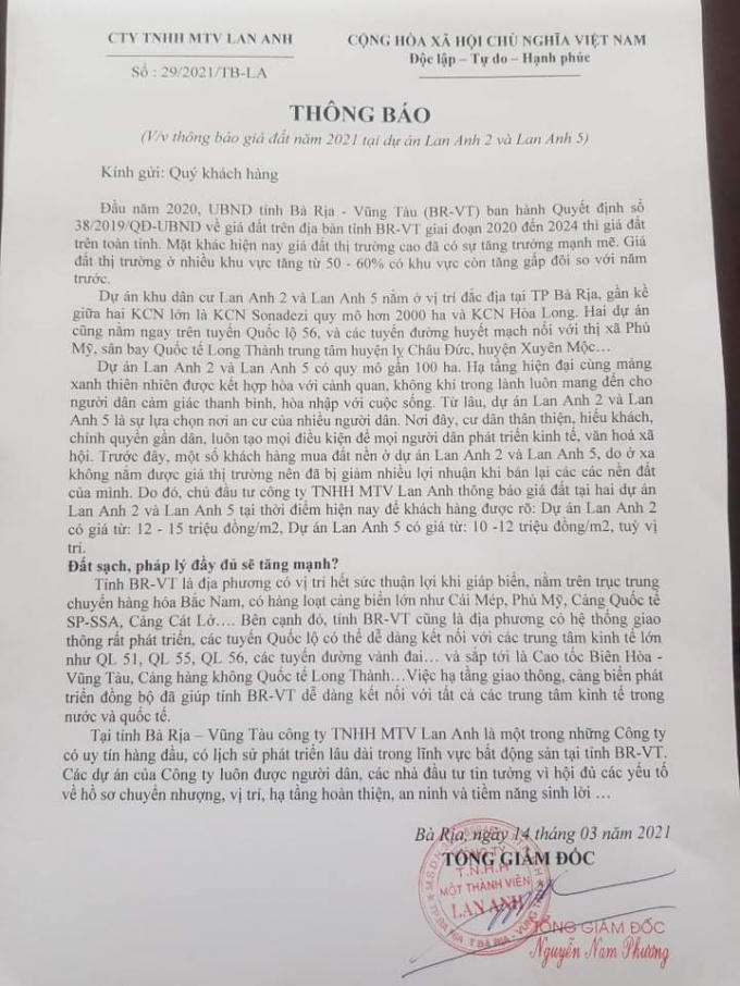 Dự án Lan Anh 2 và Lan Anh 5 có quy mô gần 100 ha. Hạ tầng hiện đại cùng mảng xanh thiên nhiên được kết hợp hòa với cảnh quan, không khí trong lành luôn mang đến cho người dân cảm giác thanh bình, hòa nhập với cuộc sống. Từ lâu, dự án Lan Anh 2 và Lan Anh 5 là sự lựa chọn nơi an cư của nhiều người dân. Nơi đây, cư dân thân thiện, hiếu khách,chính quyền gần dân, luôn tạo mọi điều kiện để mọi người dân phát triển kinh tế, văn hoá xã hội. Trước đây, một số khách hàng mua đất nền ở dự án Lan Anh 2 và Lan Anh 5, do ở xa không nắm được giá thị trường nên đã bị giảm nhiều lợi nhuận khi bán lại các các nền đất của mình. Do đó, chủ đầu tư công ty TNHH MTV Lan Anh thông báo giá đất tại hai dự án Lan Anh 2 và Lan Anh 5 tại thời điểm hiện nay để khách hàng được rõ: Dự án Lan Anh 2có giá từ: 12 - 15 triệu đồng/m2, Dự án Lan Anh 5 có giá từ: 10 -12 triệu đồng/m2, tuỳ vị trí.