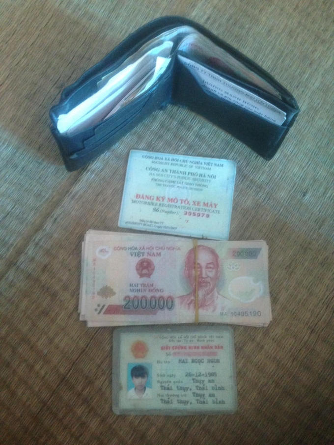 Trong ví có CMND, bằng lái xe, giấy tờ xe đều mang tên Mai Ngọc Ngon (Thuỵ An, Thái Thuỵ,Thái Bình) và 26 triệu đồng tiền mặt. Ngoài ra còn nhiều giấy tờ khác.