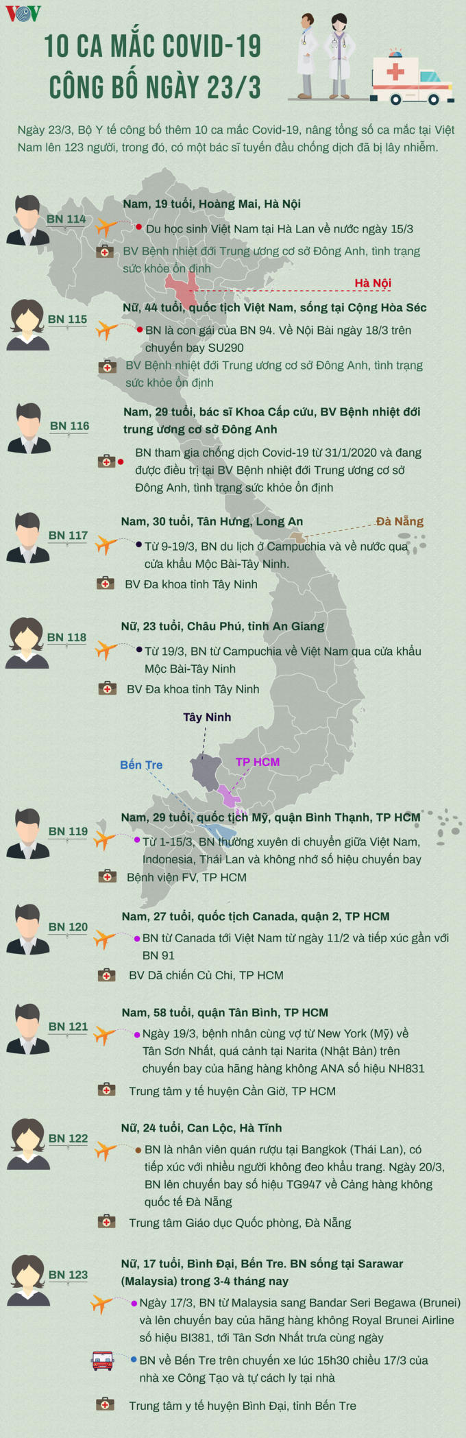 Thông tin chi tiết 10 ca mắc Covid-19 công bố ngày 23/3