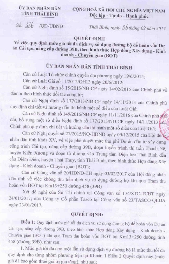 Sáng 8/2, trao đổi với PV Pháp luật Plus, đại diện Văn phòng UBND tỉnh Thái Bình cho biết, UBND tỉnh này vừa ra Quyết định số 326/QĐ-UBND ngày 6/2/2017 do chủ tịch UBND tỉnh Thái Bình, ông Nguyễn Hồng Diên ký về việc quy định mức giá tối đa dịch vụ sử dụng đường bộ để hoàn vốn Dự án Cải tạo, nâng cấp đường 39B, theo hình thức Hợp đồng xây dựng - Kinh doanh - Chuyển giao (BOT).