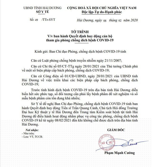 Tờ trình của Sở Y tế Hải Dương đề nghị huy động Tiến sĩ Trần Quang Cảnh đến Trung tâm Kiểm soát bệnh tật Hải Dương.